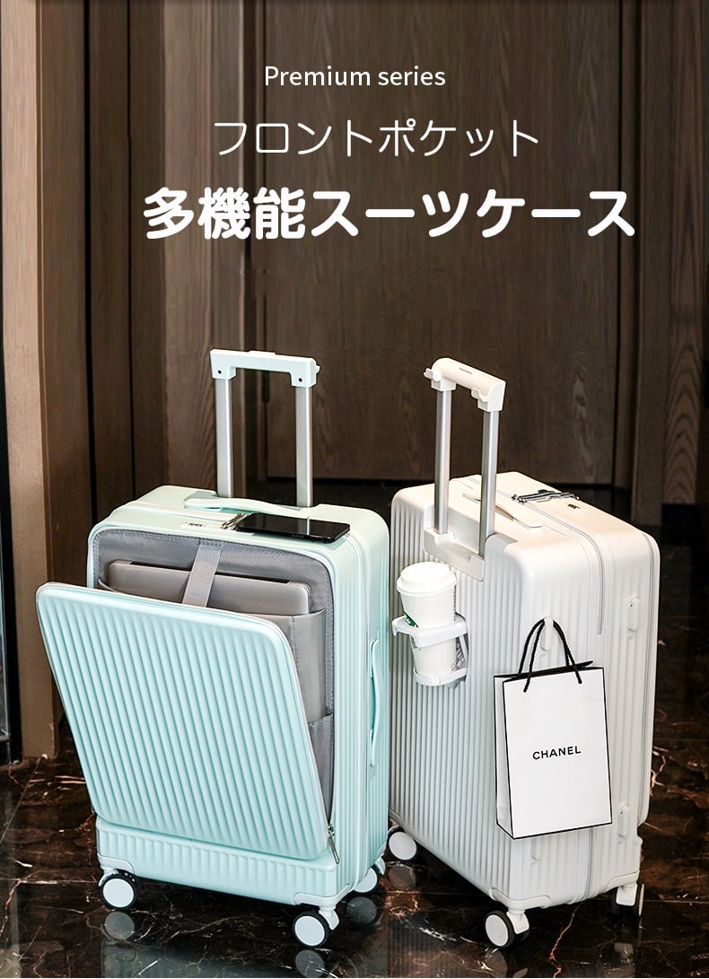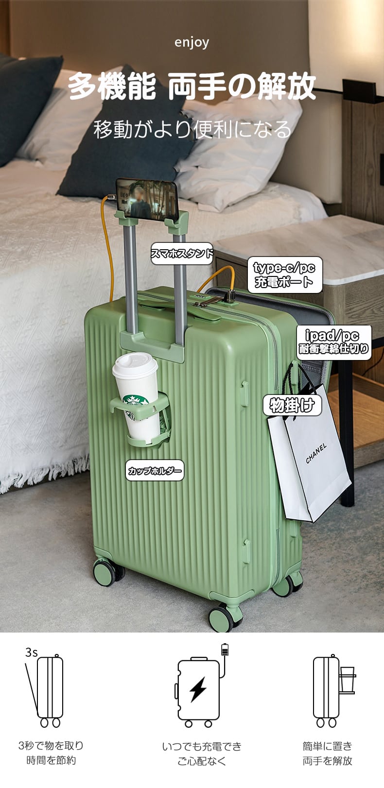 スーツケース カップホルダー 前開き 物掛けフック式底足 USBポート付き TYPE-Cポート 軽量 キャリーバッグ キャリーケース ソフト 小型 ロック ナンバーロック ダイヤルロック ダブルキャスター 静音 消音 多機能